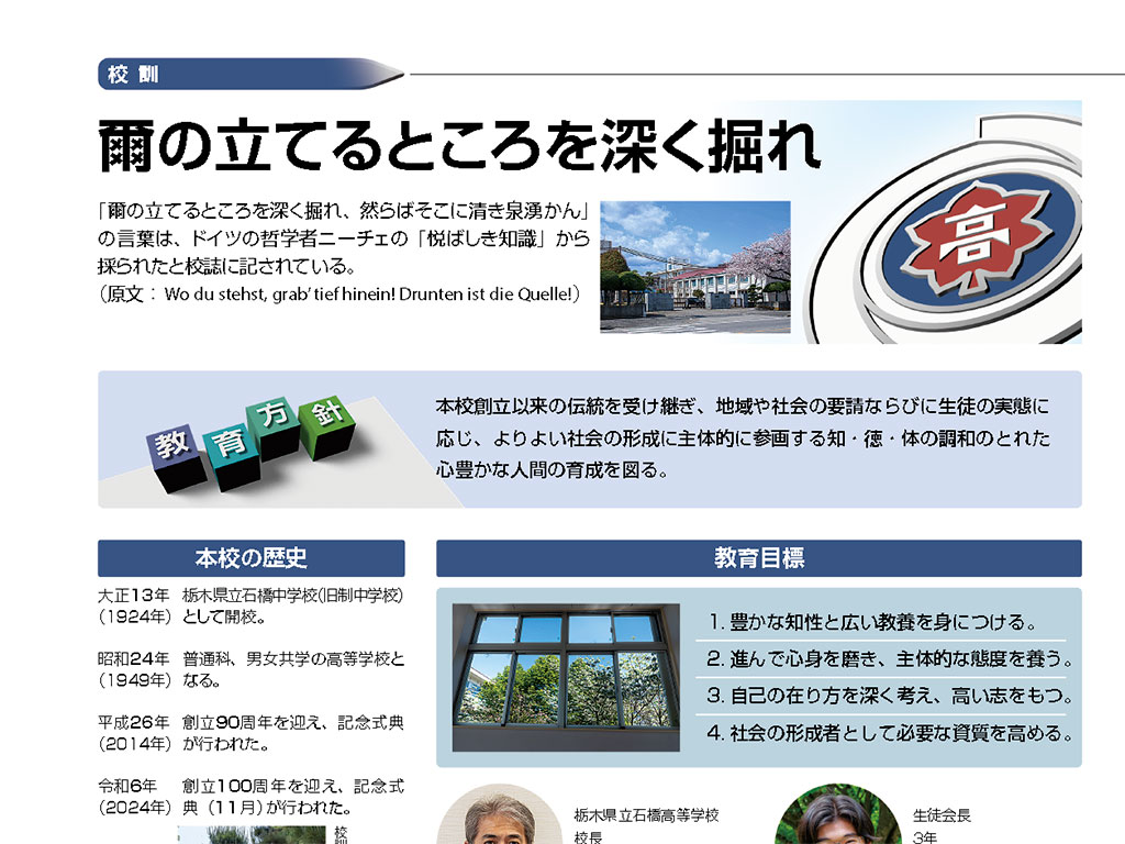 2〜3ページは校訓をキャッチコピーに「本校の歴史」「教育目標」「校長、生徒会長メッセージ」「教育課程」「在校生からのメッセージ」「クラス編成」等を紹介しています。