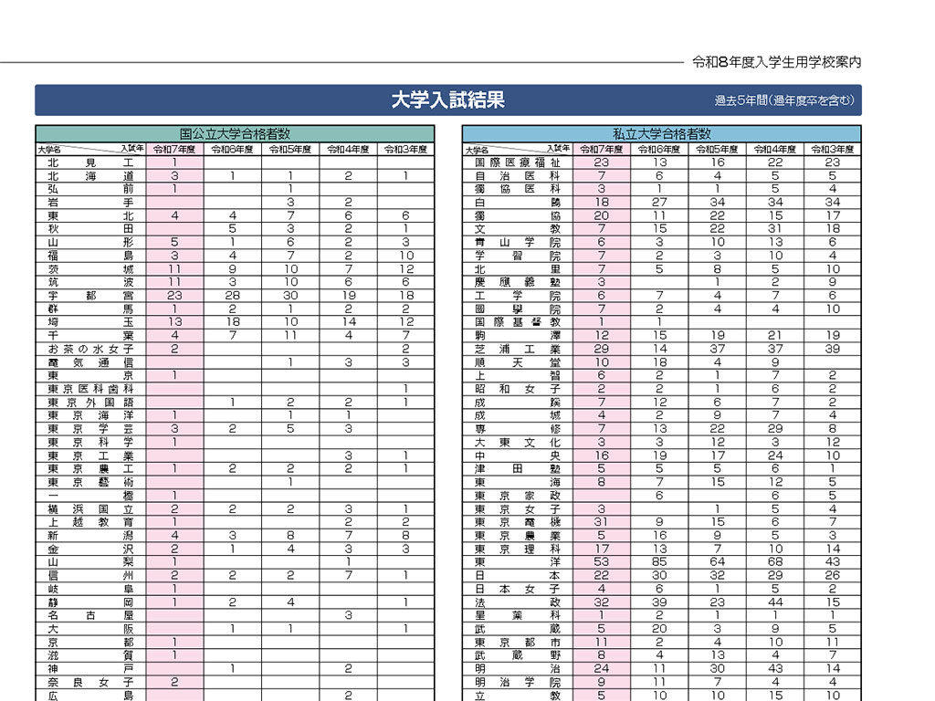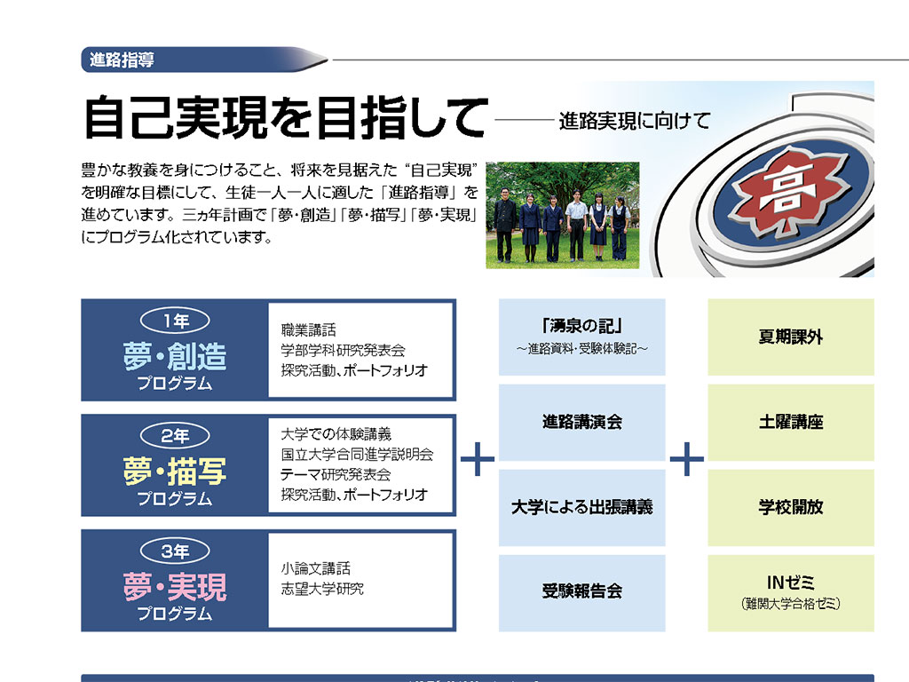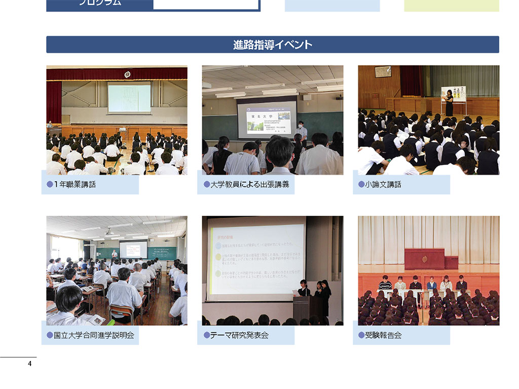 4〜5ページは「自己実現を目指して」をキャッチに、「進路指導プログラム」「進路指導イベント」「大学入試結果」「卒業生からのメッセージ」を紹介しています。