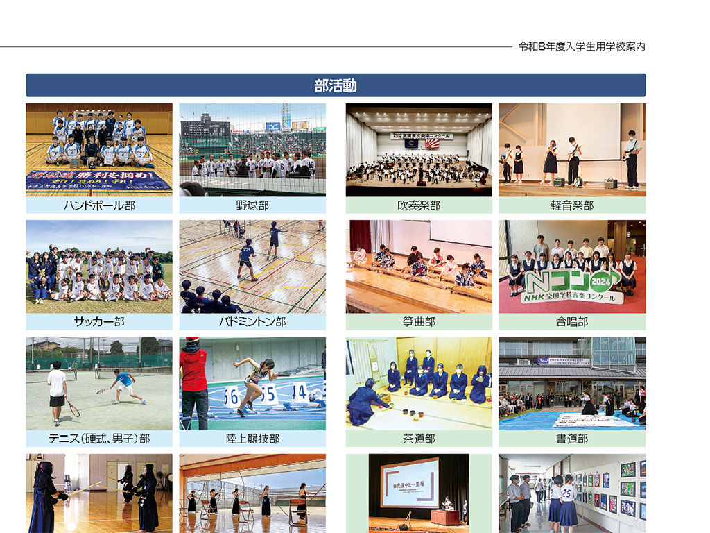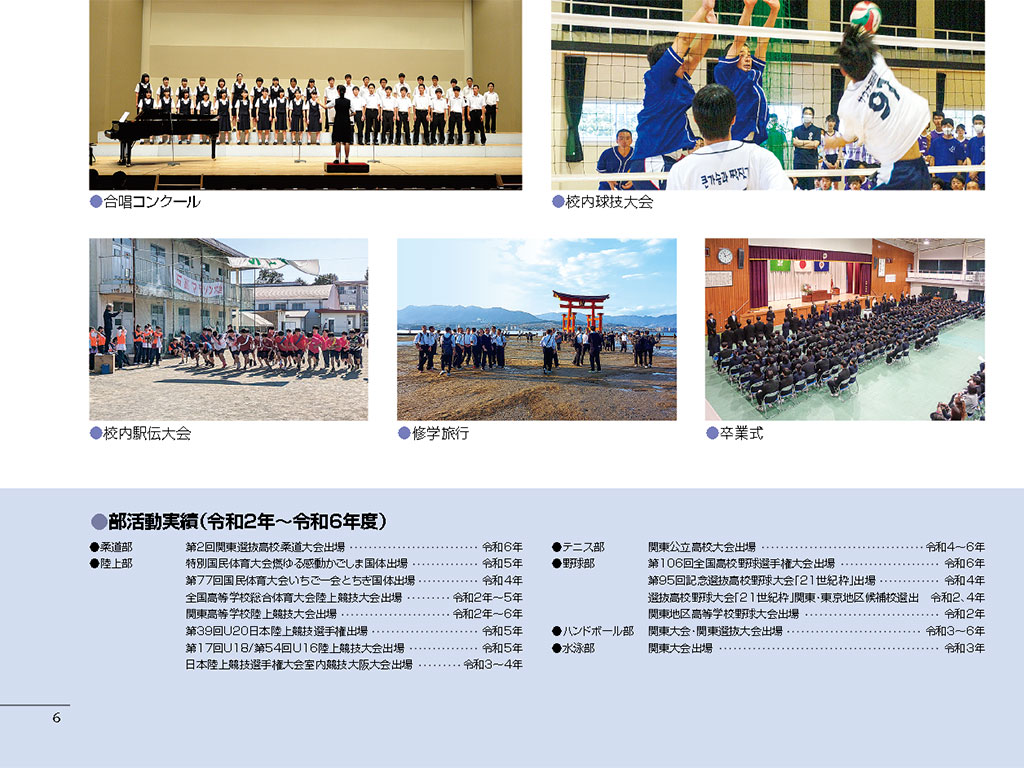 6〜7ページは「青春が咲き誇る、学校行事・部活動」をキャッチコピーに、6ページで「学校行事」を、7ページでは「部活動」をそれぞれ写真付きで紹介しています。