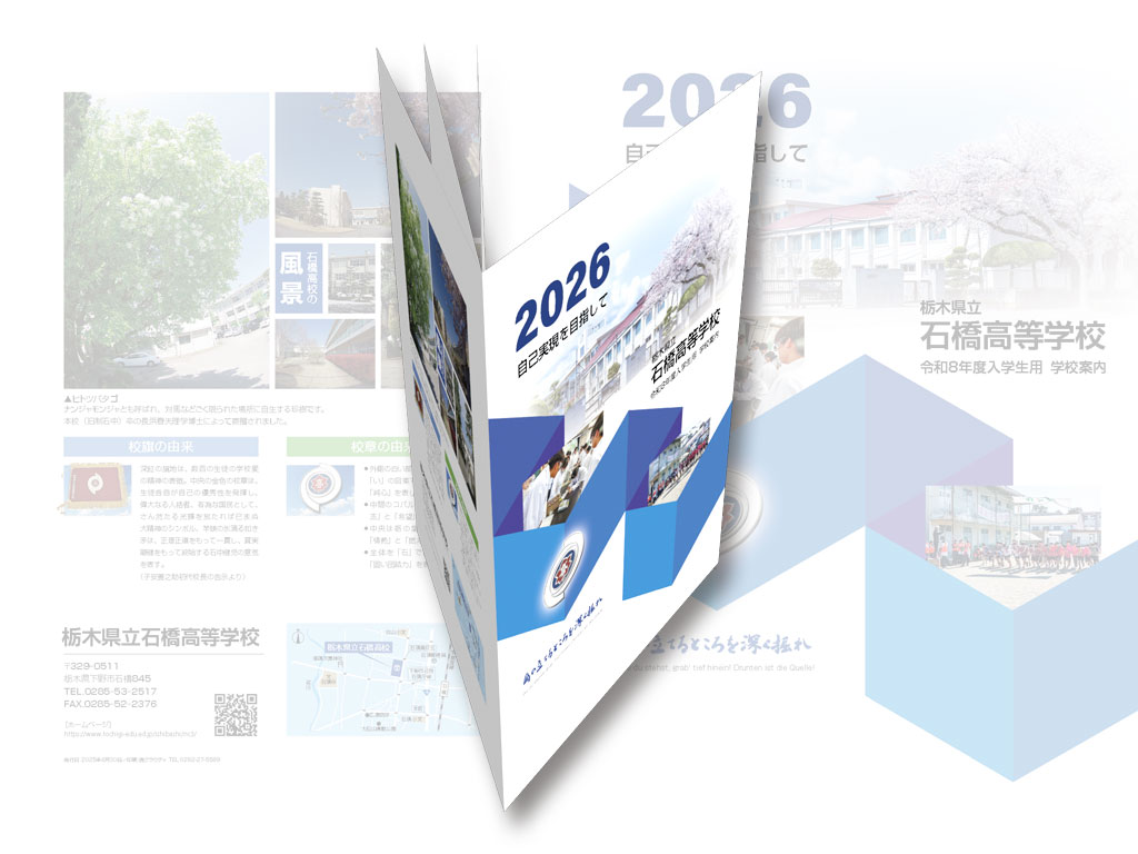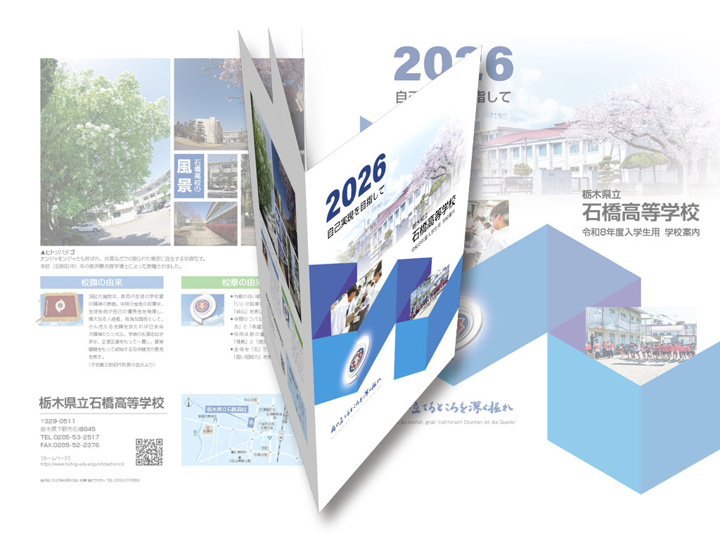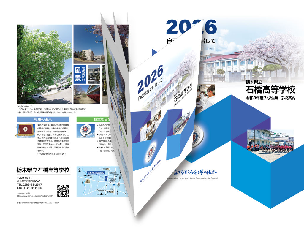 表紙は、毎年桜が咲き、学問の小道らしい雰囲気を醸し出す正門と、ブルーのパーテーション風のパターンと授業風景、持久走大会の写真で、脈々と続く同高の「文武不岐」を表現しました。