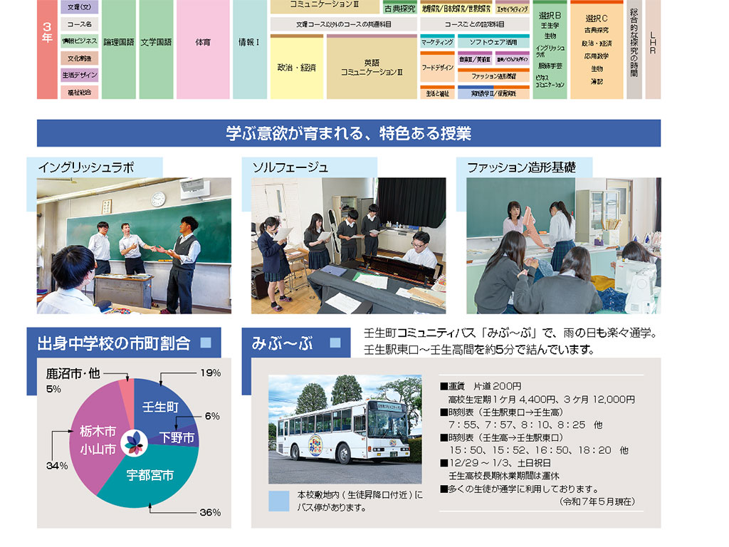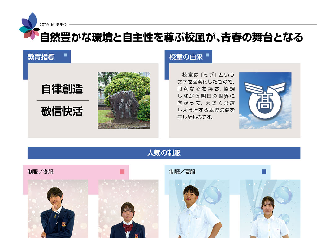 2〜3ページは「自然豊かな環境と自主性を尊ぶ校風が、青春の舞台となる」をキャッチコピーに「教育指標」「校章の由来」「人気の制服」「教育課程」「特色ある授業」等を紹介しています。