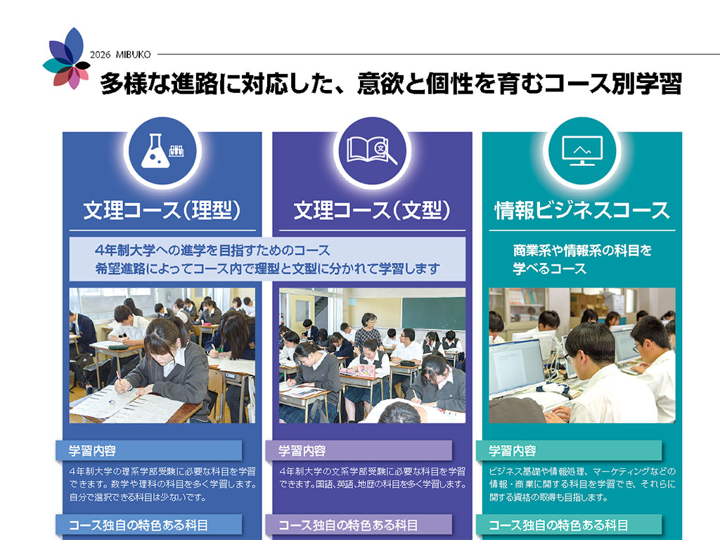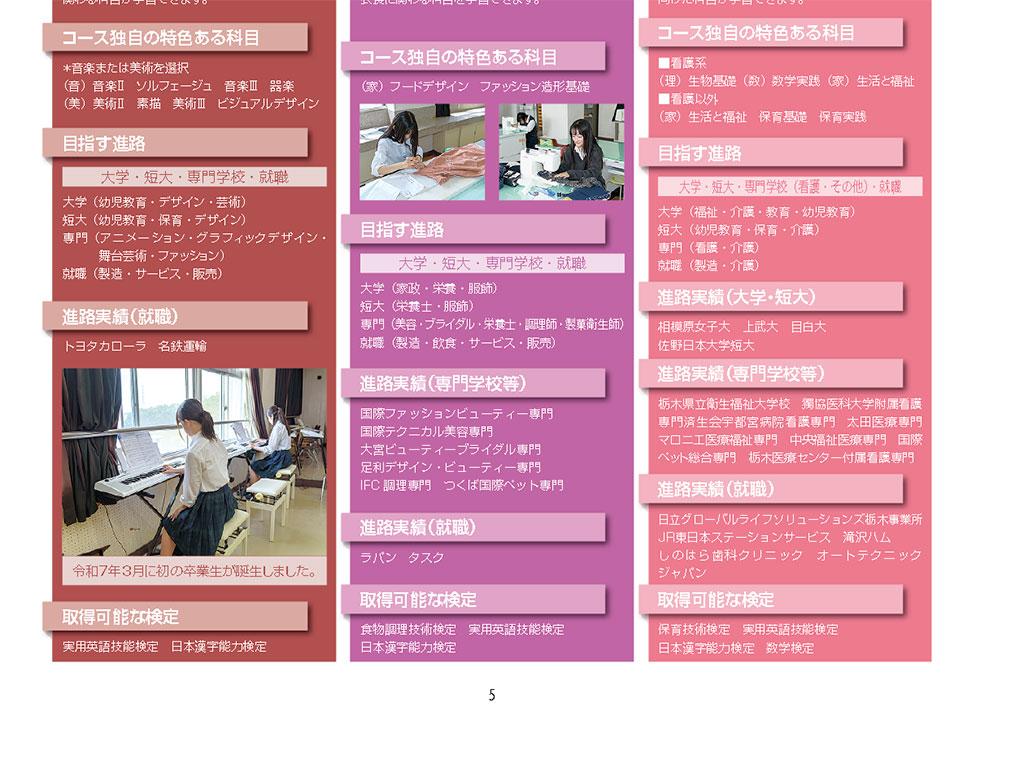4〜5ページは「文理(理型・文型の2型があります)」「情報ビジネス」「文化創造」「生活デザイン」「福祉総合」の5つに別れたコース別学習を写真と文章で詳しく紹介しています。