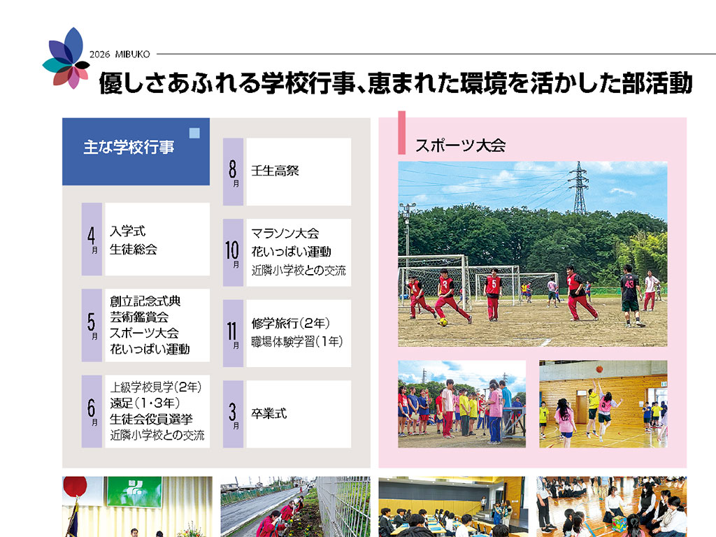 6〜7ページは「優しさあふれる学校行事、恵まれた環境を活かした部活動」をキャッチコピーに、6ページで「学校行事」を、7ページでは「部活動」をそれぞれ写真付きで紹介しています。