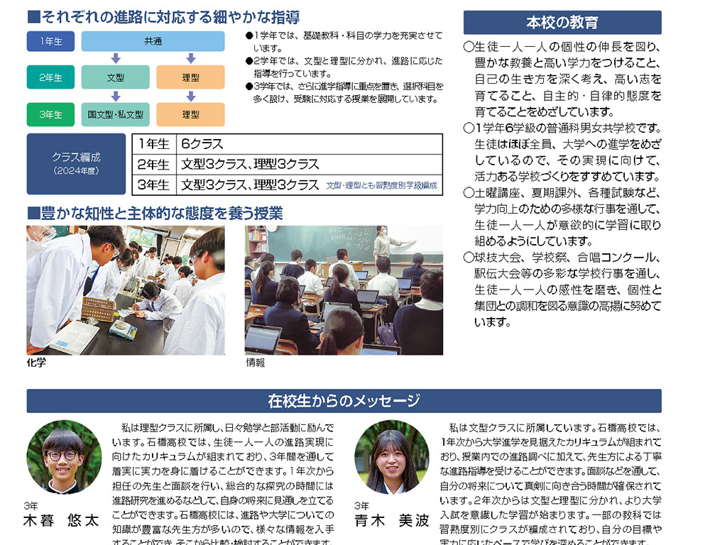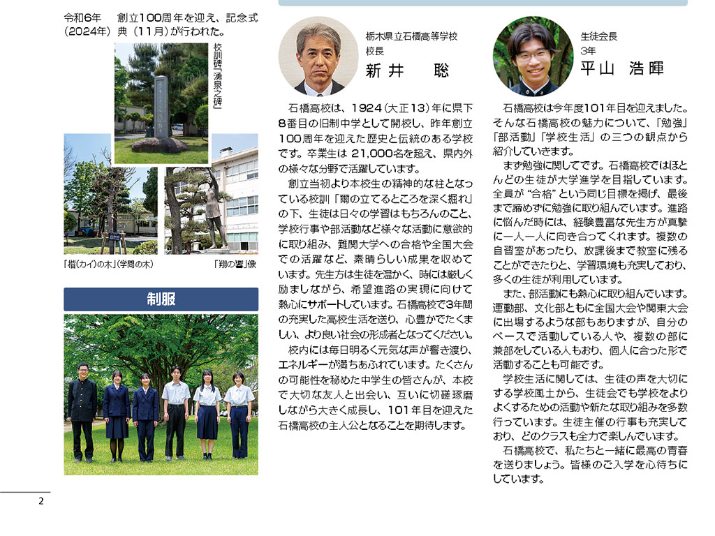 2〜3ページは校訓をキャッチコピーに「本校の歴史」「教育目標」「校長、生徒会長メッセージ」「教育課程」「在校生からのメッセージ」「クラス編成」等を紹介しています。