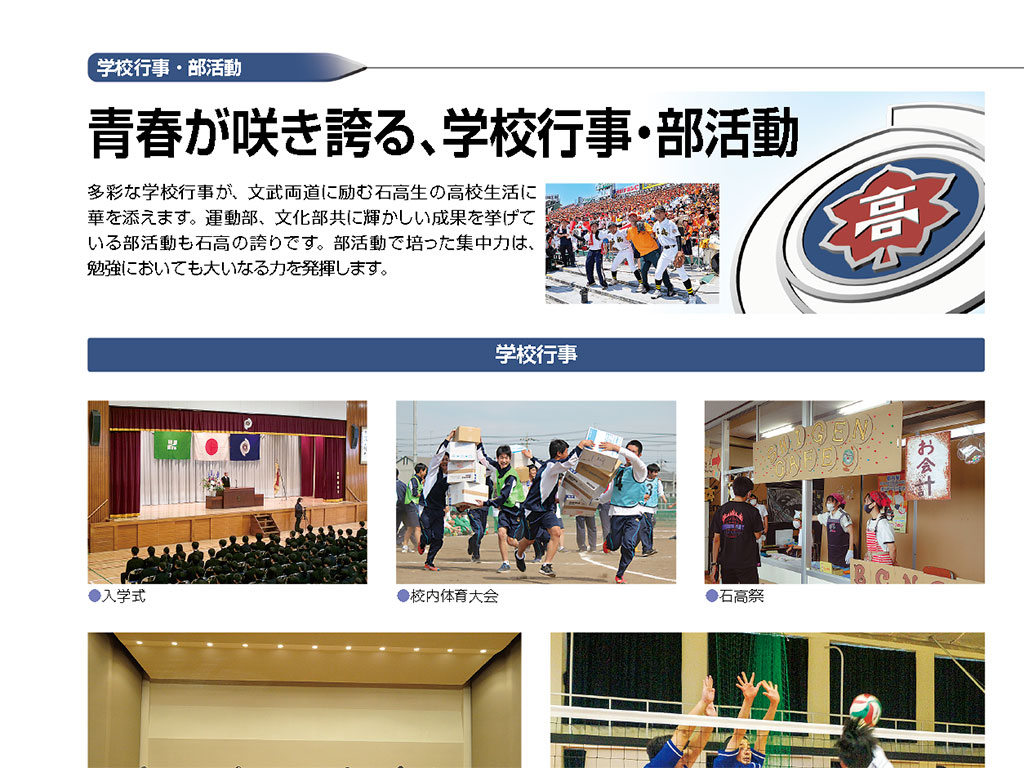 6〜7ページは「青春が咲き誇る、学校行事・部活動」をキャッチコピーに、6ページで「学校行事」を、7ページでは「部活動」をそれぞれ写真付きで紹介しています。