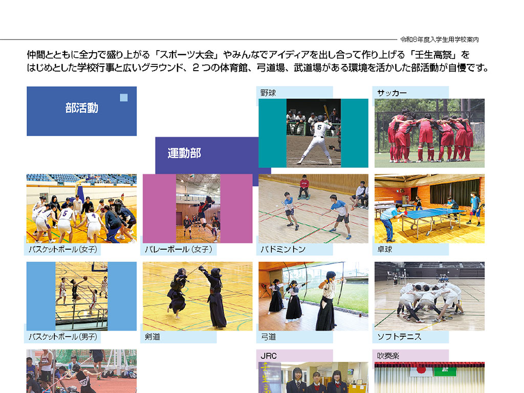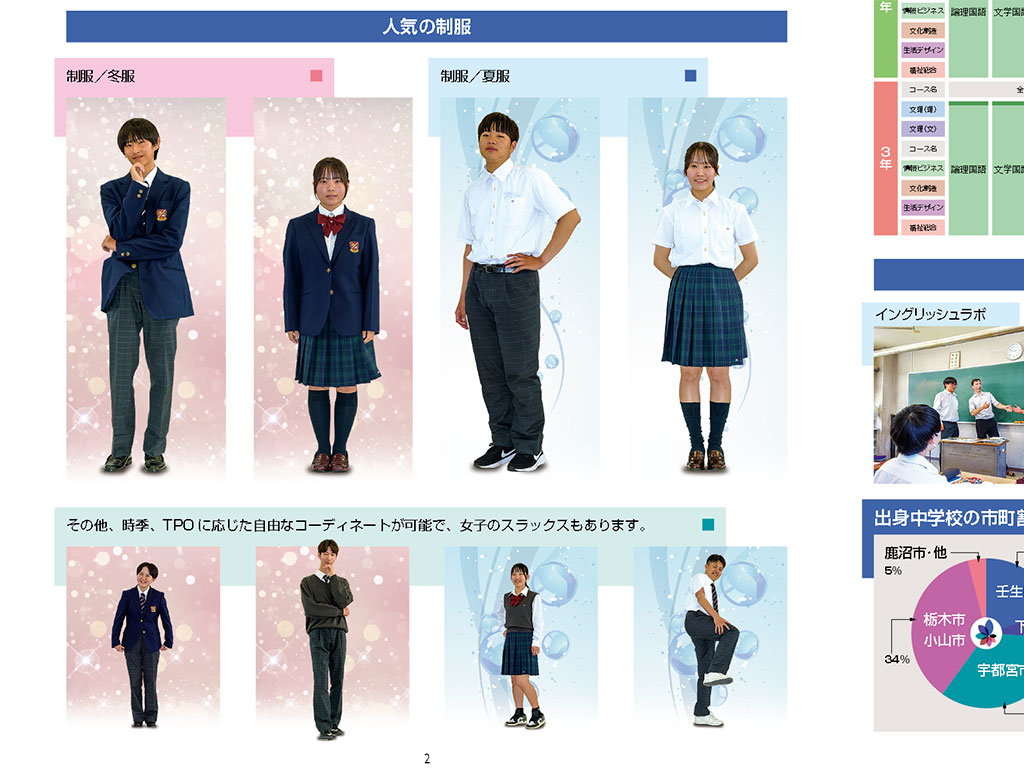 2〜3ページは「自然豊かな環境と自主性を尊ぶ校風が、青春の舞台となる」をキャッチコピーに「教育指標」「校章の由来」「人気の制服」「教育課程」「特色ある授業」等を紹介しています。
