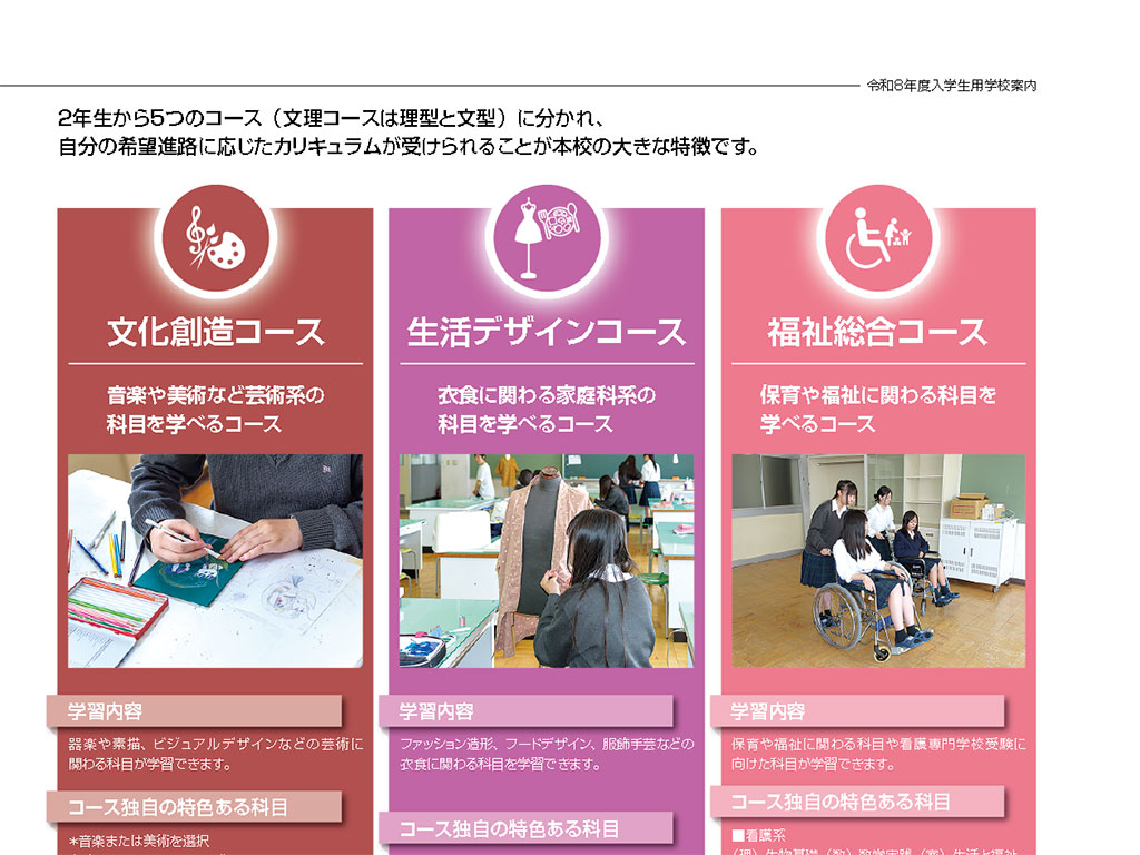4〜5ページは「文理(理型・文型の2型があります)」「情報ビジネス」「文化創造」「生活デザイン」「福祉総合」の5つに別れたコース別学習を写真と文章で詳しく紹介しています。